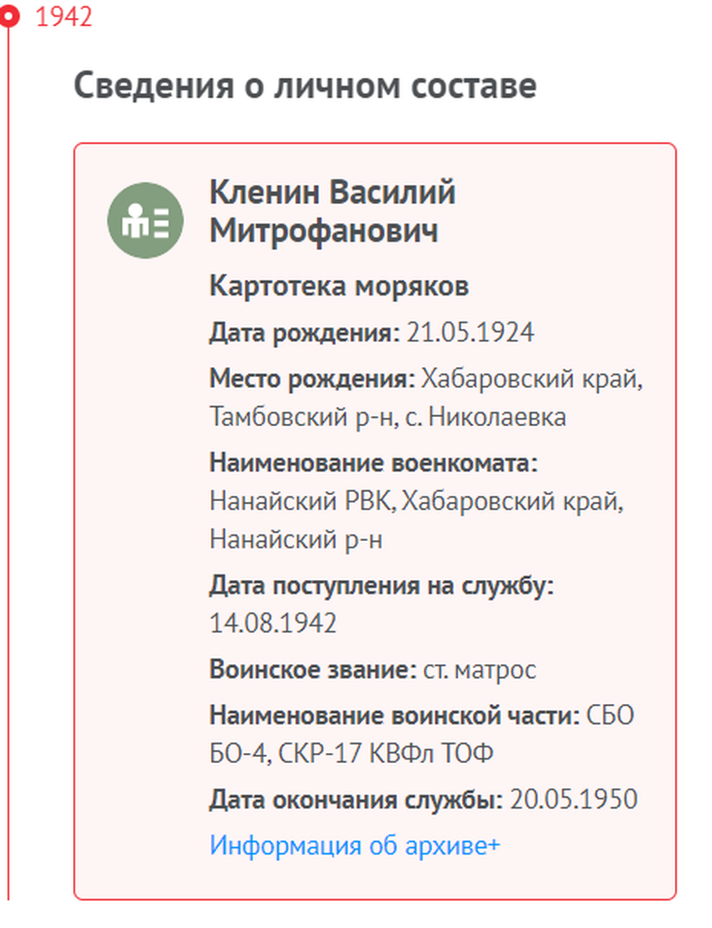 Дата призыва: 14.08.1942. с. Елабуга, Нанайский РВК