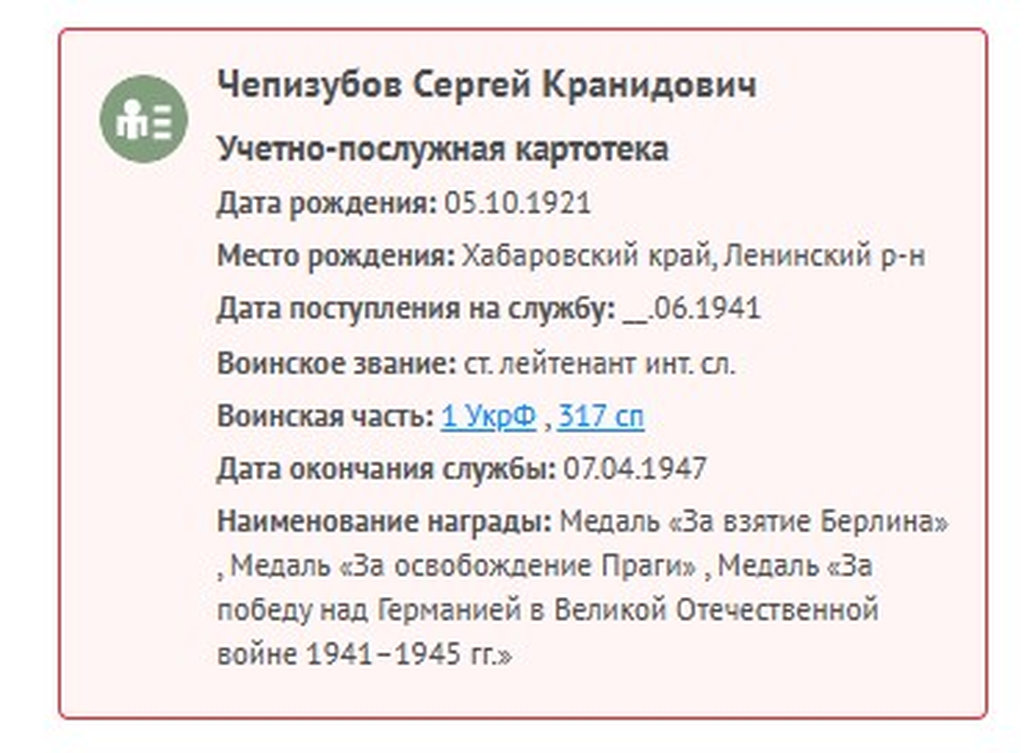 Дата призыва: 30.06.1941. с. Вятское Нанайский РВК