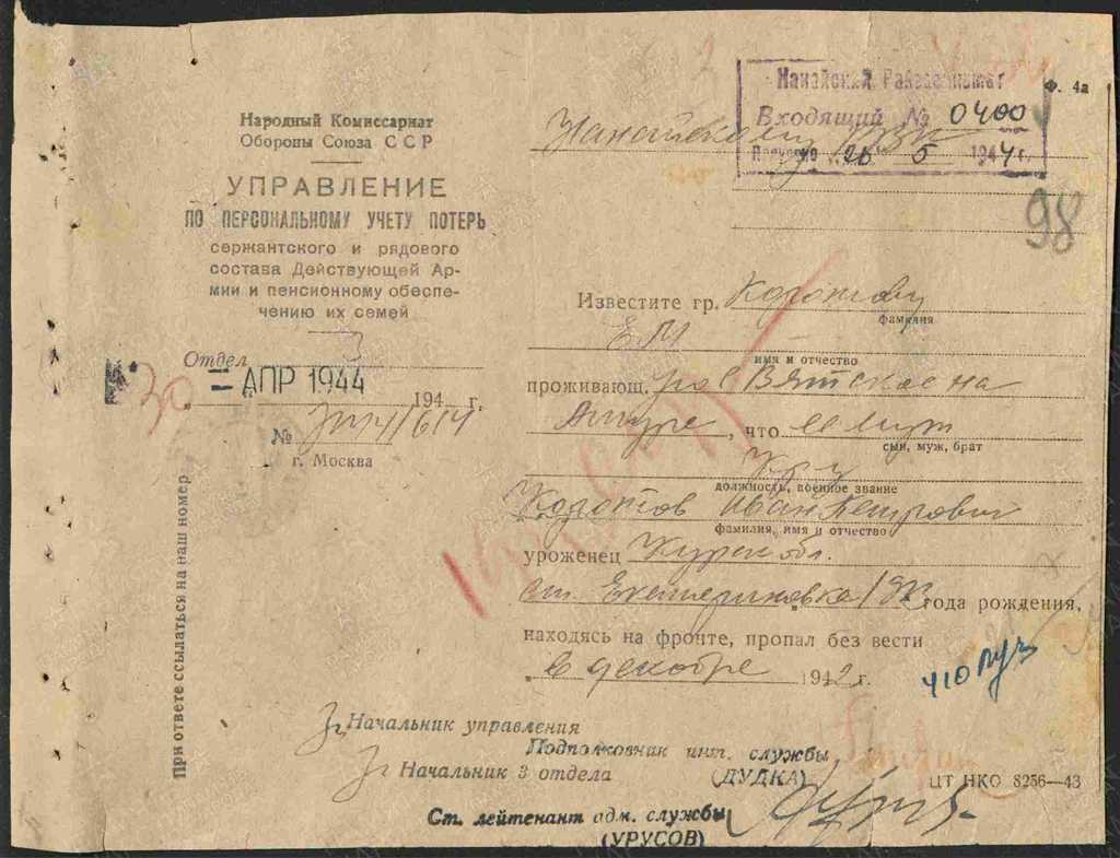 Дата призыва: с. Вятское Нанайский РВК 1941 г.