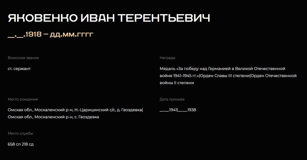 Место службы: 658 стрелковый полк 218 стрелковой дивизии